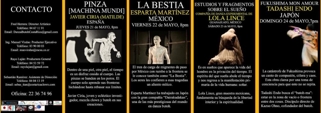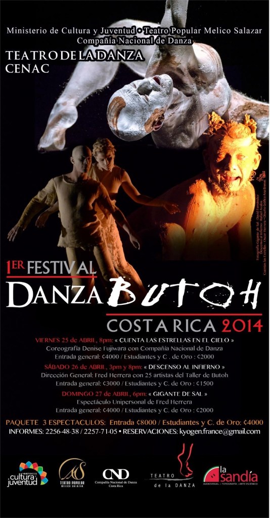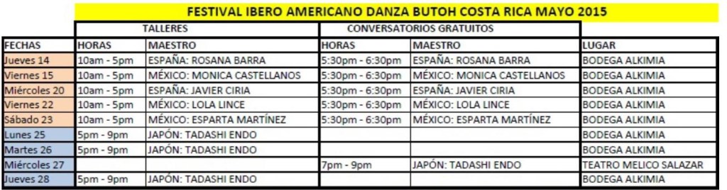 LUGAR: Los espectáculos tendrán lugar en el Teatro de la Danza, CENAC y en los talleres en la BODEGA ALKIMIA en Calle Blancos. Se presentarán ocho espectáculos diferentes y se ofrecen ocho talleres de formación en danza butoh. Es un evento sin precedentes en Costa Rica. La danza butoh es de origen japonés, pero se ha difundido por el mundo entero y en este momento tiene un gran auge en Ibero América.