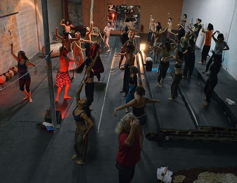 El paraíso es concebido como un lugar maravilloso, de abundancia y gracia. Sin embargo, la escasez de recursos, la rivalidad y envidia inevitable entre seres humanos, así como la enfermedad, la vejez y la muerte, hacen casi imposible lograr la experiencia de una vivencia paradisiaca como algo realmente duradero. En nuestra investigación descubrimos que lo fundamental era focalizar la mente en una materia simple, pero altamente “somatizada”, que produce significado y realización. La materia que encontramos en esta investigación fue la arcilla. Había arcilla en abundancia y permitía, pintarse, tocarse, revolcarse y explorar un nivel tan profundo de fusión psico-corporal que hacía de los ensayos de “El Paraíso”, en esa bodega donde nuevos códigos alternativos reinaban, fuera posible. En el año 2014, un taller de investigación llamado “Descenso al Infierno” fue realizado, también con una presentación en el Teatro de la Danza. La vivencia de la pintura para el cuerpo con grandes escenas de grupo logró alcanzar un grado de incandescencia psico-corporal verdaderamente extraordinario, para los actores y para los espectadores.